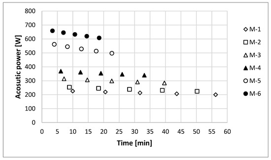 Figure 3 shows the acoustic power delivered to the mixture during each test (M-1: M-6). For all tests, a loss of the acoustic power was evident during the UAE. The average power loss was of 18% in the non-pressurized tests, but it was only of 12% in the pressurized ones. Compared to the laboratory-scale tests (75% power loss), the UAE at medium-scale seems to be more acoustically efficient thanks to the use of chilling water to cool down the mixture during the extraction. Considering the fluctuations of the acoustic power, the extraction time varied from 19 min (M-6) to 56 min (M-1).