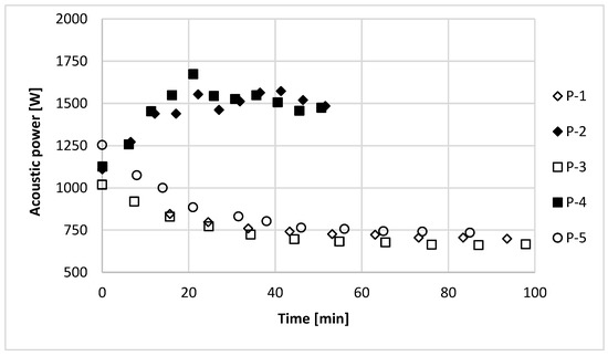 By using different constellations (sonotrode-booster) together with the pressurization of the system, it was possible to obtain different acoustic intensities (W/cm2). The acoustic intensity observed was the result not only of the acoustic power delivered but also of the surface area of the sonotrode used (cm2). The acoustic intensity varied as the acoustic power did. The highest acoustic intensities corresponded to the pressurized tests; they were 58 ± 6 and 44 ± 5 W/cm2 for tests P-2 and P-4, respectively, while the lowest figure was observed in test P-1 and P-3 with intensities of 23 ± 4 and 30 ± 2 W/cm2.