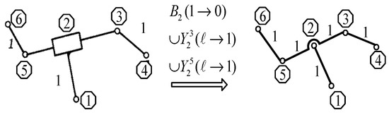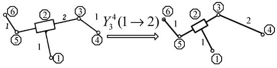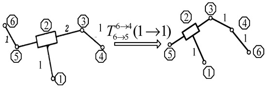 A schematic diagram of the translocation operation is shown in Figure 1. The octagon represents the serial number of the kinematic pair, and numbers on the bar show the kinematic size. The translocation operation represents that kinematic pair 2 is changed from 1 to 0, and varies from prismatic pair to revolute pair.