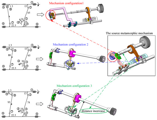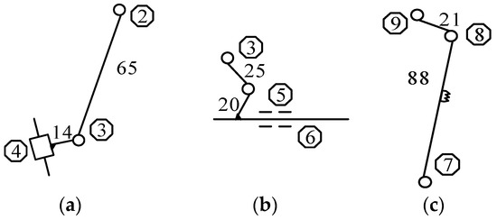 Configuration scheme sets of each metamorphic element of the feed mechanism. Configuration set of metamorphic (a) element 1, (b) element 2, and (c) element 3.