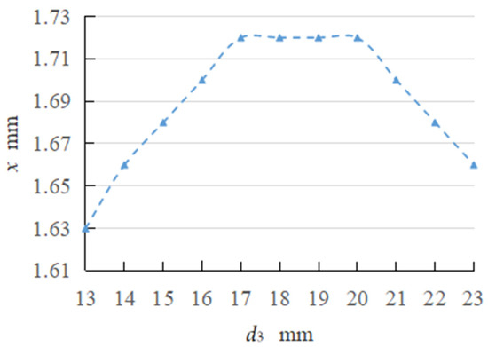 Setting d2 as 65 mm and d6 as 25 mm, the influence of kinematic size d3 on the displacement x is revealed, as shown in Figure 8, where kinematic size d3 is a function of displacement x. When the kinematic size d3 increases from 13 mm to 23 mm, the distribution of displacement x generally presents a ladder shape. When d3 increases from 13 mm to 17 mm, the displacement x increases by 5%. Even when d3 increases continuously, the displacement x essentially remains unchanged. When d3 ≥ 21 mm, the displacement x shows a downward trend, x decreases by less than 4%. Therefore, the increase of d3 results in the change of displacement x within a smaller range, implying that the change of variable d3 is not sensitive to the displacement x. In order to control the size of the feed mechanism, the variation range of d3 ranges from 13 to 17 mm.