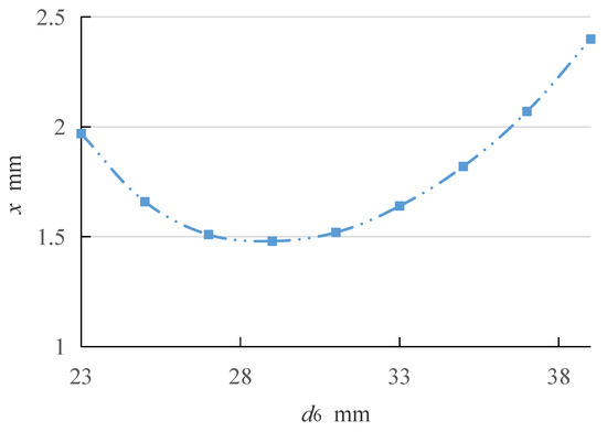 Setting d2 as 65 mm and d3 as 14 mm, Figure 9 shows the relationship between the kinematic size d6 and the displacement x. When the kinematic size d6 increases from 23 mm to 38 mm, the relationship curve is parabolic with a minimum value. With the increase of d6, the displacement x gradually decreases. When d6 continues to increase, the displacement x gradually increases in excess of the minimum value, but the increasing trend becomes slower. When d6 increases from 29 to 39 mm, the increment x is less than 1 mm as a result of the excessive increase in the size of the feed mechanism. Therefore, the variation range of d6 is from 23 mm to 25 mm.