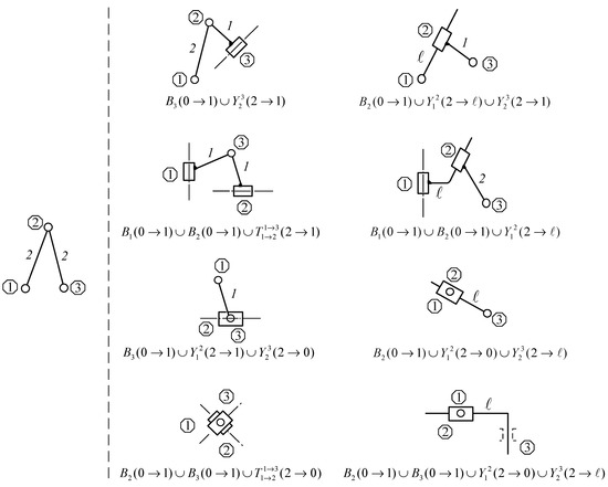 It can be seen from Figure 5 that the feed mechanism is decomposed into three kinds of source metamorphic elements belonging to Assur group II (Assur group: the simplest component group with zero degrees of freedom) [31]. According to the principle of similarity, the configuration design of metamorphic elements is also primarily determined by Assur group II. Figure 10 shows the configuration scheme set of Assur group II and the corresponding variation modes.