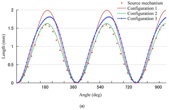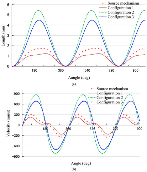 The amount of upward and downward movement of the feed dog can be interpreted by the lifting height. The larger the lifting height, the greater the feed force, which is suitable for thick material sewing. In Figure 14a, the displacement of mechanism configuration 1 has the largest value of 1.99 mm, which is 20% higher than that of the source mechanism, as a result of the common influence of both the eccentric wheel on the lower shaft and the feed bar slide block assembly at the same time. The displacement of mechanism configuration 2 is almost equal to the source mechanism. The displacement of mechanism configuration 3 is about 1.81 mm, which is about 1% larger than that of mechanism configuration 2 due to the slight difference between them.