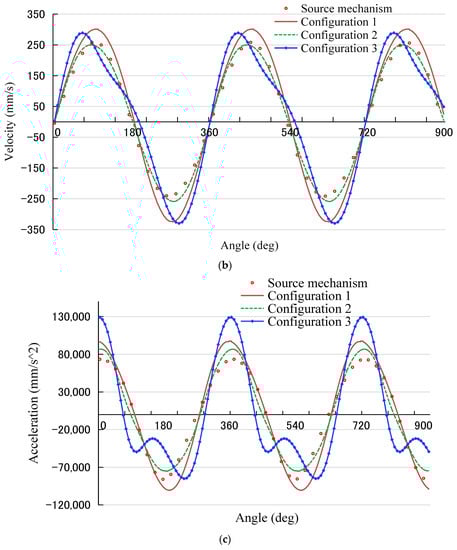 In Figure 14b, the velocity curve of each mechanism exhibits the sine wave, and velocity fluctuations of mechanism configuration 3 are slight. In Figure 14c, the acceleration curve of the source mechanism, mechanism configurations 1 and 2 are similar to cosine waves. In spite of the acceleration curve of mechanism configuration 3 being similar to a cosine wave, fluctuations are approximately180°, 540°, etc. The reason is that there is a larger distance between the lower shaft and the feed rocker shaft compared to those of the rest of the mechanism configurations, which changes the initial angle of the feed bar shaft against the lower shaft, with an angle offset by 10.15° as well, incurring the variation of the mechanism movement. Thus, the more the acceleration motion fluctuates, the greater the change in motion inertia force. The displacement, velocity and acceleration motion curves of mechanism configurations 2 and 3 are quite different, reflecting that the kinematic sizes will also have a sufficient impact on the performance of the working machine. This demonstrates that the lifting height of the feed dog in mechanism configuration 1 is relatively larger, but a smaller needle distance is suitable for sewing thick material. Larger needle distances of mechanism configurations 2 and 3 are appropriate for the highly efficient working conditions. The comprehensive movement of mechanism configuration 2 is significantly stable for the higher speed parts.