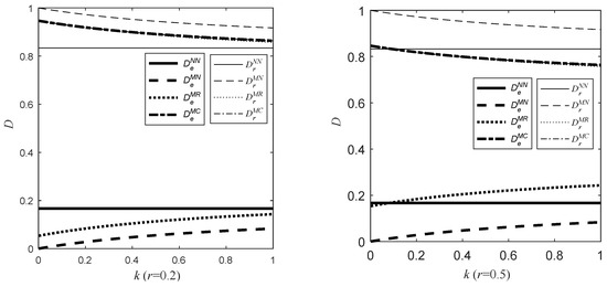 Figure 3 analyzes the impact of the percentage of residual value per unit of returned product value impairment and return compensation on the profit of the online retailers. As the residual value per unit of returned product value increased, the profit of the online retailers increased, and it was more beneficial for the online retailers when the loss from the returned product was lower. Comparing the four strategies, the paper showed that the profit of online retailers was highest under the NN strategy when k was extremely low, indicating that the online retailers prefer not to offer returns when the loss from returns is extremely high (i.e., the NN strategy). At , the profits of online retailers under the MN strategy were higher than those under the MR and MC strategies, indicating that when the compensation given to consumers for returns is low, it is much less attractive to consumers, so choosing the MN strategy instead saves the loss of paying return insurance, and profits are higher. In contrast, the profit under the MR strategy was higher than that under the MC strategy because the return insurance was borne by the online retailers and could attract more consumers. At , when k was lower, the profit of online retailers under the MR and MC strategies was higher than under the MN strategy, indicating that despite the lower value of impaired unit returns, it is more attractive to offer returns to consumers at this time owing to the higher compensation to consumers under the MR and MC strategies. As k increased, profits under the MN strategy increased significantly above profits under the MR, MC, and NN strategies, indicating that online retailers prefer to return products rather than offer a return fee when the unit residual value after impairment of the returned product is higher.