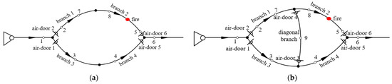 - In the ventilation network with a diagonal branch, when the ventilation velocity is 1.70 m/s, the back-layering flow spreads to the diagonal branch and branch 1. The longest distance between the back-layering flow of branch 1 and the fire source is 1.50 m, and the wind velocity in the adjacent branches and the diagonal branch increases.
