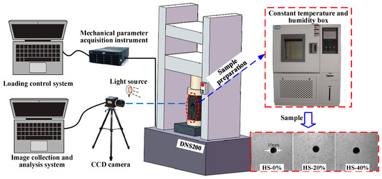 Specimen preparation was divided into two processes: original sample forming and water treatment. The original sample was formed by mixing gypsum and water with a mass ratio of 7:3 to make pulp [36,37]. When configured, the specimen slurry was filled into a 70 mm × 70 mm × 70 mm square specimen box, a prefabricated drilling device was placed inside the box, and the processing error was checked to ensure that it satisfied the international standards for rock mechanics specimens. The specimen was treated, and air bubbles in the slurry were expelled by vibration. The mold was removed after 24 h for maintenance, placed in a cool and ventilated place for 30 d, and polished after solidification. The prefabricated scattered spots of black matte paint on the specimen surface, which were applied on a uniformly sprayed white matte primer, dried after being sprayed to create a random pattern. The average moisture content of a saturated specimen is 40% [38]. Therefore, a YED/HS-150-type constant-temperature and -humidity test chamber was used for drying and water retention [39]. The specimens were divided into three groups—dry, 20% moisture content and 40% saturated moisture content—with five specimens in each group. Each sample was named according to “sample type–moisture content–serial number”. For example, HS-40%-1 represents the No. 1 saturated specimen, HS-20%-1 represents the No. 1 control specimen, and HS-0%-1 represents the No. 1 dry specimen. During sample maintenance, the coal samples were weighed every 24 h until the sample weight m1 was constant, and then the samples were removed.