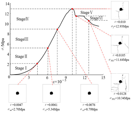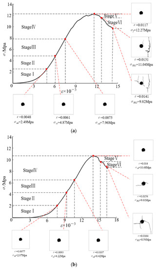 As shown in Figure 2 and Figure 3, the dry and moisture-bearing specimens show identical progressive failure trends. Table 1 shows that the failure process can be divided into six stages: