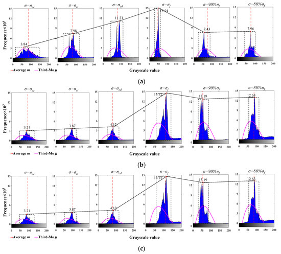 Grayscale histogram of the failure process of the specimen. (a) HS-0%. (b) HS-20%. (c) HS-40%.