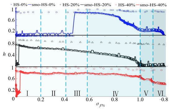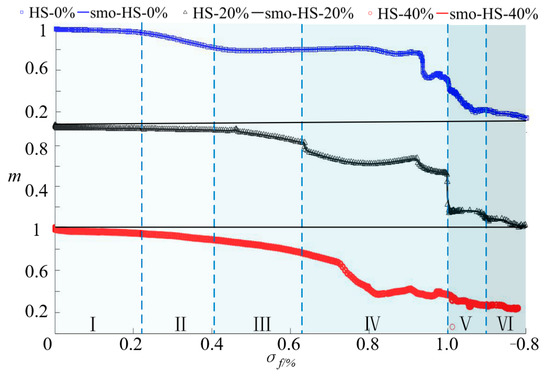 Considering the experimental variability, the gray mean, entropy, and standard deviation of the three grayscale characteristic parameters of the HS-0%, HS-20%, and HS-40% grayscale images during loading are separately calculated. To suppress the influence of directional components on the calculated results of the specimens, the results are normalized, where the horizontal coordinates of the curve are the stress levels, the negative values are the residual stresses after the peak of the stress–strain curve, and the vertical coordinates are the normalized values of the grayscale characteristic parameters.