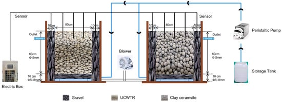 In this study, a CWs dynamic experimental device was constructed to compare the Pb and Cd removal efficiency of various substrates. Figure 1 illustrates the CWs system consisting of a storage tank with synthetic wastewater, a peristaltic pump, two CWs units, a blower, an electric box, and two effluent tanks. Two groups of horizontal subsurface flow CWs reactors were made of plexiglass with a length of 1 m, a width of 0.5 m, and a height of 0.8 m, which was filled with 0.1 m gravel as the supporting layer, and the upper part of the gravel was filled with the selected substrates. The horizontal direction of the reactor set an outlet every 0.2 m, and one group of electronic probes was placed every 0.2 m along the top of the water flow as an online analysis. Real-time monitoring took place of pH value and DO of wastewater each hour, and the water environment chemical changes in the reactor were monitored in real time. Canna indica L. seedlings had similar growth on the top of the reactor.