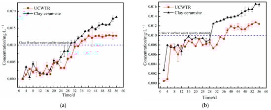 When the average influent Pb concentration was 12.9 mg/L, the dynamic changes of the effluent Pb concentration after the two groups of horizontal subsurface flow CWs were operated continuously for 56 days are shown in Figure 2a. With the extension of the operation time, the average Pb removal rate of the two groups of units reached 99%, but the Pb concentration in the effluent first fluctuated and then gradually increased, and the Pb concentration in the effluent of the UCWTR-based CWs remained stable in the later period. During the whole operation period, the Pb concentration in the effluent of the two groups of units reached the “Integrated Wastewater Discharge Standard (GB 8978-1996)”. In the first 20 days, the Pb concentration in the effluent of the two groups of units fluctuated, and the average Pb concentrations in the effluent of UCWTR and clay ceramsite-based CWs were 0.0022 mg/L and 0.0024 mg/L, respectively. In the later stage, the Pb concentration in the effluent of CWs gradually increased, and the Pb concentration in the effluent of UCWTR and clay ceramsites-based CWs reached 0.0128 mg/L and 0.0183 mg/L on the 56th day. During the whole operation period, the removal rate of Pb in wastewater by the two groups of units reached more than 99.8%, and the removal rate of Pb in wastewater by UCWTR-based CWs continued to exceed 99.9%. The above results show that the two sets of devices have strong removal efficiency for Pb, and can continuously and efficiently purify Pb to make it meet the “Integrated Wastewater Discharge Standard (GB 8978-1996)”. In addition, UCWTR can enhance the removal efficiency of Pb in wastewater by CWs, and the overall effluent was lower than that of clay ceramsite-based CWs, and can maintain a stable removal effect in the later stage.