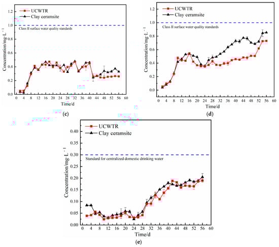 When the average influent Zn concentration was 47 mg/L, the dynamic change of effluent Zn concentration is shown in Figure 2d. With the prolongation of operation time, both sets of devices can remove more than 97% of Zn in the wastewater, and the Zn concentration in the effluent reaches the “Integrated Wastewater Discharge Standard (GB 8978-1996)”, but the Zn concentration shows a fluctuating upward trend as a whole. In the early stage of operation (0~10 d), the concentration of Zn in the effluent of UCWTR and clay ceramsite-based CWs increased rapidly by 8.89 times and 10.71 times. However, the growth rate slowed down in the later period. By the 56th day, the Zn concentration in the effluent of UCWTR and clay ceramsite-based CWs increased to 0.7294 mg/L and 0.8544 mg/L, respectively. The overall change trend of Zn concentration in the effluent was similar to that of Cd, which indicates that the adsorption behaviors of the two ceramsites to Cd and Zn were similar, and they are first adsorbed on the surface of ceramsite through electrostatic action. Then, under the action of -OH, Si-O-Si, Al-OH, etc., it further diffuses into the ceramsite, which may be related to the electronegativity of Cd and Zn, and the competitive adsorption capacity is quite related [].