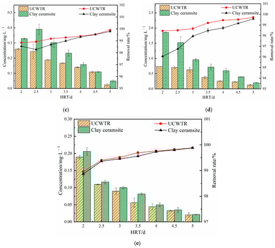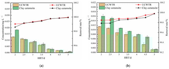 With the increase of HRT (2~5 d), the concentration of heavy metals in the effluent of the two groups of devices changes as shown in Figure 3. The concentrations of Pb, Cd, Cu, Zn, and Fe in the effluent of the two groups of devices were all inversely correlated with HRT. With the increase of HRT, the effluent concentration continued to decrease, but the removal rates of heavy metals were all above 95%. When HRT increased from 2 days to 5 days, the concentrations of Pb and Cd in the effluent of UCWTR and clay ceramsite-based CWs decreased from 0.013 mg/L, 0.011 mg/L and 0.018 mg/L, 0.016 mg/L to 0.003 mg/L, 0.0013 mg/L and 0.0009 mg/L, 0.0014 mg/L, decreased by 97.64%, 88.60% and 95.08%, 91.25%, respectively. The removal rates of Pb and Cd in the simulated wastewater of the two groups of devices were stable at above 99.7%, and the concentration of Pb and Cd in the effluent can meet the discharge standard when the HRT was 3 days, and the concentration of Cd in the effluent can also meet the discharge standard when the hydraulic retention time was 3.5 days. When HRT was extended to 5 days, the effluent Zn concentration of UCWTR and clay ceramsite-based CWs increased from 0.73 mg/L and 1.86 mg/L decreased to 0.13 mg/L and 0.20 mg/L, and the removal rate increased from 98.45% and 96.05% to 99.73% and 99.58%, respectively. Regardless of the HRT changes, the concentration of Cu and Fe in the effluent can meet the “Integrated Wastewater Discharge Standard (GB 8978-1996)”.