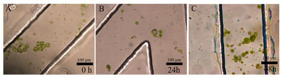 The separation and cultivation of protoplasts in crossed microfluidic channels at 0 h (A), 24 h (B), and 48 h (C).