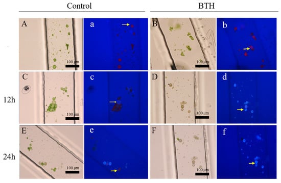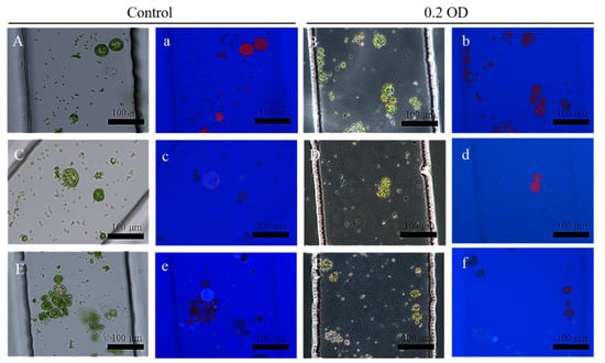 The cell wall regeneration of protoplasts in microchannels treated with benzo-(1, 2, 3)-thiadiazole-7-carbothioic acid S-methyl ester (BTH). (A,C,E) show the cell wall regeneration of protoplasts treated by the control under the white light; a, c, and e show the cell wall regeneration of protoplasts treated by the control under the fluorescent light. (B,D,F) show the cell wall regeneration of protoplasts treated with the BTH under the white light; b, d, and f show the cell wall regeneration of protoplasts treated with the BTH under the fluorescent light. Protoplasts of (A) (a) and (B) (b) at 0 h, (C) (c) and (D) (d) at 12 h, and (E) (e) and (F) (f) at 24 h.