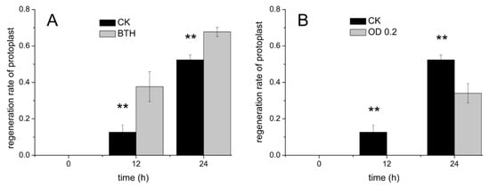 (A) The cell wall regeneration rates of protoplasts treated with BTH. (B) The cell wall regeneration rates of protoplasts treated with Pseudomonas syringae pv. tomato DC3000 (Pst DC3000). An asterisk (*) represents a significant difference (* p < 0.05, ** p < 0.01).