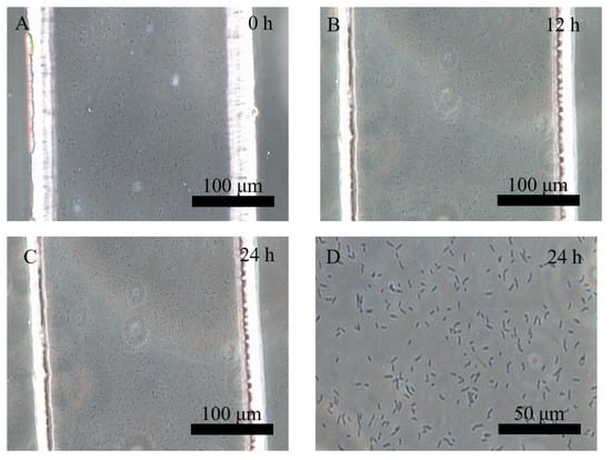 The separation and cultivation of Pst DC3000 in crossed microfluidic channels at 0 h (A), 12 h (B), and 24 h (C), and the magnified image of Pst DC3000 at 24 h (D).