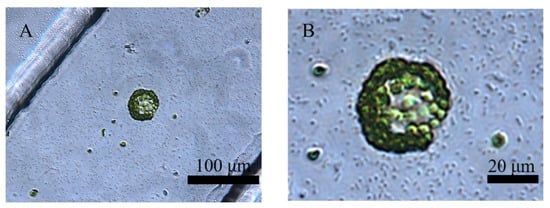 To realize the separation, cultivation, and continuous monitoring of protoplasts in situ, a crossed microfluidic device was constructed. The protoplasts were injected into the crossed microchip channels with a microsyringe pump at a low flow rate of 0.5 µL/min for 40 min to disperse the protoplasts in the microchip channels. As shown in Figure 1, the protoplasts with a diameter of 20–30 µm were dispersed into crossed channels. The integrity and activity of protoplasts within the 48 h continuous culture suggested that the crossed microchip channels are suited to the separation, cultivation, and continuous observation of protoplasts in situ. It should be emphasized that, compared with the single channel, the crossed microchannel of our study can supply more opportunities for protoplasts to choose, which will help to separate and obtain a single protoplast.