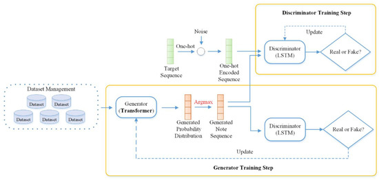 Considering the similarity between music and language, some language generation models can be converted to generating music. This approach represents note embedding by vectors. Embedding [10] was a concept initially used in NLP. Its principle was to obtain the vector representation of each word, note, or chord through training a neural network with a corpus and then use the result as the input to the network for downstream tasks. In music, each major or minor chord has three notes as the tonic of the mode. In other words, the whole song surrounds the tonic and its related chords [11,12]. In addition to this obvious relationship between notes, there are also invisible relationships in music [13], corresponding to anaphora in language. This is why it is important to choose a transformer as the core model for music generation. In addition, GANs are widely used in imaging, language, and music by training the discriminator and generator in the network to optimize them, ensuring the final authenticity of the generated results [14]. GANs are now coming into use to generate music sequences [15]. A critical difficulty to consider is that the generated sequence must be fed into a discriminator because of the network architecture of the generating countermeasure network. Therefore, this study proposes a new model structure that combines a transformer [16] and GANs [17] to create music. The study also presents a unique loss function to enable the system to learn and update the parameters in the two gradient descent directions of “real music” and the target sequence [18].
