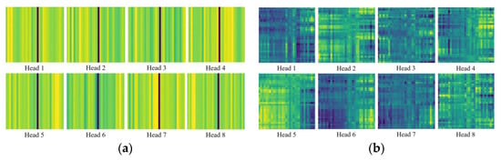 In addition, the multihead attention mechanism in the transformer recognizes the relationship between input and output units. Figure 4a shows the input and output attention without using the optimization loss function, and Figure 4b shows the output attention after training with the optimization loss function.