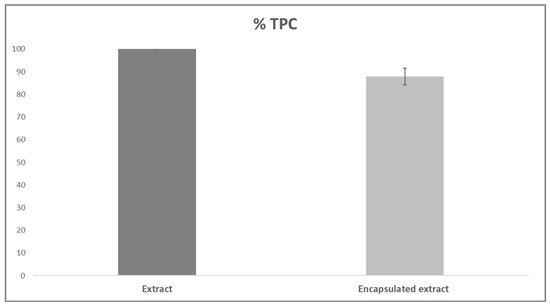 Comparison of the retention (%) of total polyphenols (TPC) in blackthorn flower extract encapsulated under optimized conditions (MD + 25%GA, WM/e.d.m. ratio 0.5, 120 °C) in relation to the total phenolic content of non-encapsulated extract.