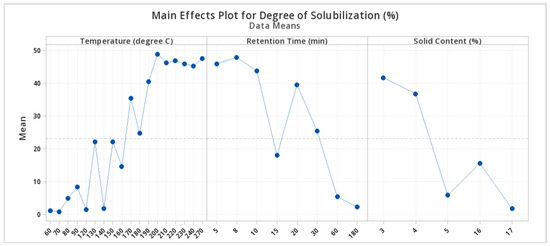 Main effect plot for the degree of solubilization after HTP vs. temperature, retention time, and solid content.