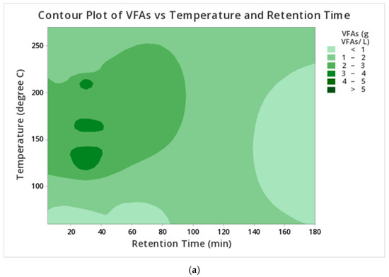 Most of the studies [33,36,37,38,39,40] reported a relatively increased VFA production under high temperature ranges from 160 °C to 180 °C. For the fermentation process to be efficient, other studies reported that an optimum temperature of 100 °C to 180 °C is required to disrupt the cell walls and make them readily available for biological disintegration [33,41]. A fermentation process operated below the standard temperature is likely to achieve low quantities of VFAs [39,41].