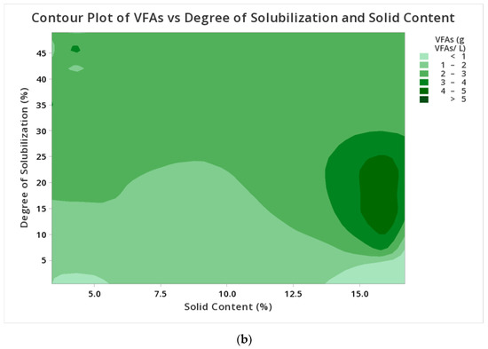 Contour plots for VFA production vs. solubilization and hydrothermal pretreatment parameters, (a) Contour plot of VFA vs. temperature and retention time, (b) Contour plot of VFA vs. COD solubilization due to HTP and solid content of sludge.