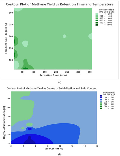 Contour plots for methane production, (a) methane yield vs. temperature and retention time, (b) methane yield vs. degree of solubilization and solid content.