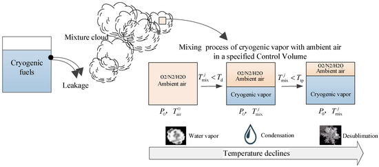 As shown in Figure 1, once the cryogenic fuel leaks into the environment, the affected ambient air will be cooled by the cryogenic vapor (), and condensation/desublimation will occur with continuous temperature reduction. In Figure 1, is the temperature of the mixture cloud at time j, is the initial ambient air temperature, is the ambient pressure, and and respectively denote the dew point and triple point of water vapor in the air. This process is shown in the P-T phase diagram of water in Figure 2.