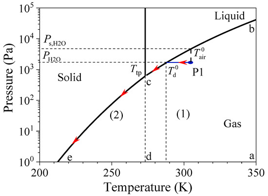 As shown in the P-T phase diagram of water (Figure 2), if the temperature exceeds the initial dew point , the water vapor partial pressure PH2O does not change with the decreased temperature, but the saturation water vapor pressure Ps,H2O declines. When the temperature drops to the saturation line, the initial dew point is first reached, and the saturation water vapor pressure Ps,H2O is equal to the water vapor partial pressure PH2O. Hereafter, the water vapor partial pressure PH2O begins to decline with continuous water vapor condensation during the temperature drop process along the saturation line. In addition, the dew point continuously declines with water vapor condensation. Thus, the correlation between the water vapor partial pressure PH2O(T) and the saturation water vapor pressure on the dew point Ps,H2O(Td) is given as follows: