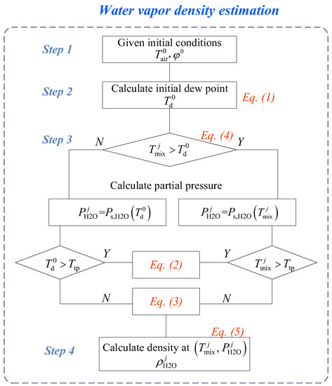 In summary, the procedure of water vapor density estimation with the adiabatic mixing of cryogenic vapor and moist air can be seen in Figure 4. The first step is deriving the initial conditions of the ambient air, and . Secondly, the initial dew point can be solved by Equation (1). The third step regards the water vapor partial pressure solution, which is based on temperature comparisons between the mixture cloud temperature, the dew point and the triple point. Then, Equations (2) and (3) are used for larger and lower than triple point cases, respectively. Fourthly, the water vapor density can be solved by EOS.