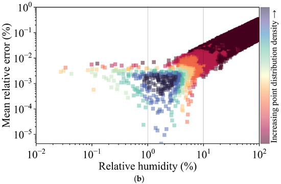 Figure 5 displays the distribution density and deviation versus the temperature and relative humidity φ. A further exploration of the validation results shows that the presented model has higher sensitivity to humidity φ than temperature T. It can be found that the model gives a high accuracy of MRE < 0.03% in the low-humidity region (φ < 10% RH), and gives relatively larger deviations of 0.002–0.35% in the medium and high humidity regions (φ > 10% RH). However, temperature is not significantly sensitive to MRE. The reason for this is that the calculated water vapor’s partial pressure value is strongly affected by the relative humidity, and the influence of temperature is only reflected in the saturated water vapor pressure, which does not vary dramatically in the region of 273–320 K. Thus, the yielded water vapor density is sensitive to relative humidity, and the sensitivity to temperature is very slight.