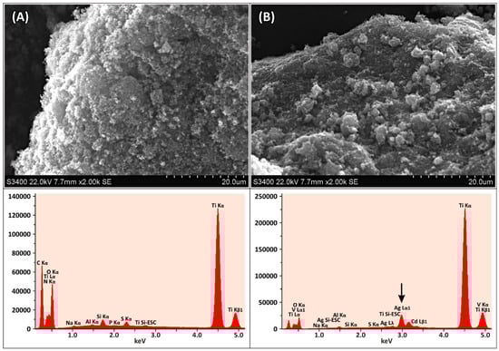 SEM micrograph and EDS analysis results of (A) TiO2 and (B) Ag-doped TiO2 particles.