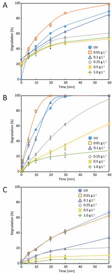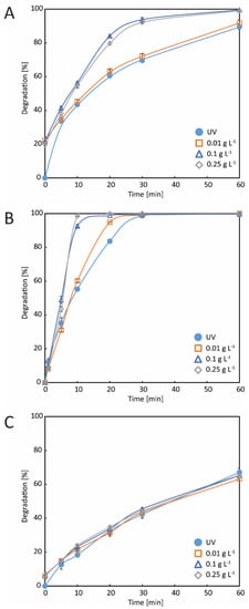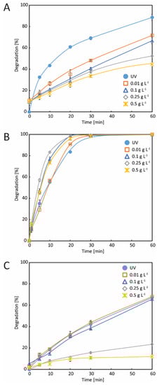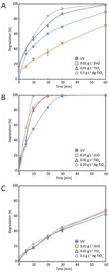 The phenomenon of decreased degradations obtained for both ZnO and TiO2 after the addition of the catalyst (Figure 2 and Figure 3) may be caused by both light absorption and diffusion, due to the presence of the catalysts suspended in the solution. Apparently, the capability of ZnO and TiO2 to support the degradation is much lower than the loss of efficiency caused by lower irradiation reaching the tested compounds. Therefore, the surface degradation cannot be calculated as the difference between the total degradation and the bulk solution degradation observed in the test using UV irradiation only. Interestingly, no such phenomenon was observed for Ag-TiO2 (Figure 4). Even the smallest addition of this catalyst induces more degradation compared to the reduction in the bulk solution degradation caused by its presence. Nevertheless, it must be taken into account that even for Ag-TiO2, the surface degradation and the bulk degradation observed in the test using UV irradiation only may also not be additive.