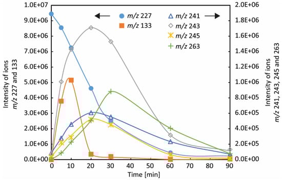 The degradation products formed in the tests were identified using the LC-MS/MS system described in Section 2.2. The samples were injected into a Kinetex Evo C18 column (150 mm × 2.1 mm I.D.; 2.6 µm) from Phenomenex (Torrance, CA, USA) maintained at 35 °C. The mobile phase (5 mM ammonium acetate in water and acetonitrile (ACN)) was used at a flow rate of 0.3 mL min−1 in the following gradient: 0 min 20% ACN, 1 min 20% ACN, 5 min 100% ACN, 7 min 100% ACN. The eluate from the column was directed to the ESI source operating in positive ionization mode. The source and mass spectrometer parameters were as follows: source temperature of 450 °C, source voltage of 4500 V, nebulizer gas nitrogen at 40 psi, curtain gas nitrogen at 10 psi, auxiliary gas nitrogen at 45 psi, declustering potential of 50 V, collision gas nitrogen at 6 psi. Mass spectra were recorded in the 50–400 m/z range. For selected ions, chromatograms and their fragmentations were recorded in the enhanced ion product mode.
