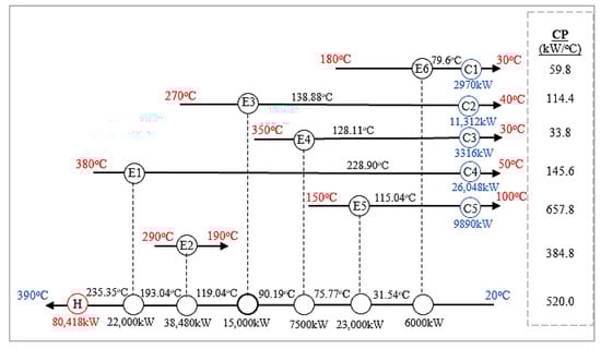 The most critical data needed to conduct the approach involves stream heating and cooling information, as shown on the HEN grid diagram in Figure 1. The HEN includes six hot streams, as shown at the top of the figure running from left to right. The network has only one cold stream running from right to left at the bottom of the figure. Hot and cold streams exchange heat using six heat exchangers (E1–E6). In addition, one heater (H) and five coolers (C1–C5) are shown in the HEN with their heat loads. The temperature profile (°C) along the streams and heat capacity flow rates CP (kW/°C) are shown, as well as the heat load (kW) for each heat exchanger in HEN. The minimum heat transfer driving force between hot and cold streams in the HEN is 35 °C, which is called the heat recovery approach temperature (HRAT).