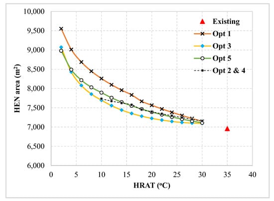 Due to the heat load shifting using combined paths, the obtained results of area targeting are showing the HEN area profile with HRAT values for the five options, as illustrated in Figure 3. The profile showed the total HEN area increasing step-wisely with shrinking HRAT values for each path combination option. Compared with the existing case, all options performed in a prime way, with option 3 taking the least and best area performance along the descending HRAT. Options 2 and 4 showed a typical performance, although they were made of different combinations of utility paths, with a short profile from 10 to 30 °C of HRAT. Before 10 °C, these two options showed excessive heat shifting that resulted in –ve values of utility duties that were not considered logically.