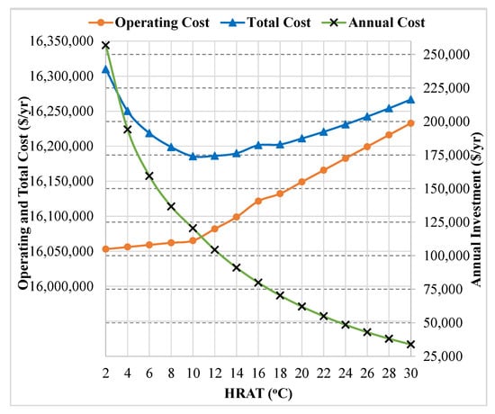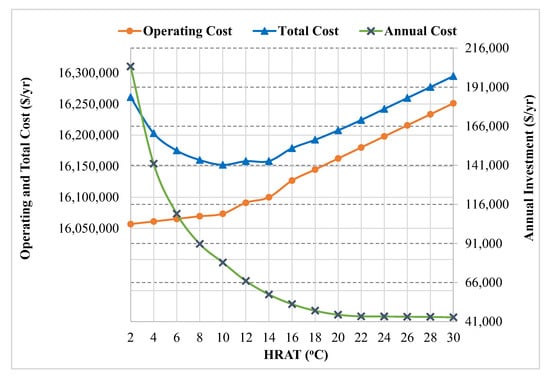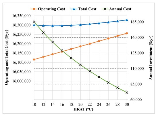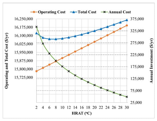 To determine the optimum HRAT value for each path’s combination option, the total cost profile was to be defined for the lowest cost along with the range of HRAT vales. The total cost was the summation of both operating and annualized costs, as shown in Equation (19) below.