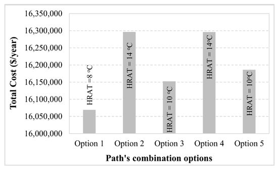 Although options (2) and (3) consist of different path combinations, they show a cost targeting of a typical profile, as illustrated in Figure 5. Since HRAT values ranged only between 10 and 30 °C, these options showed a semi-horizontal profile for the total cost. However, the minimum optimum HRAT value seemed to be more operable, namely, 14 °C at a higher total cost of 16.3 × 106 $/y.