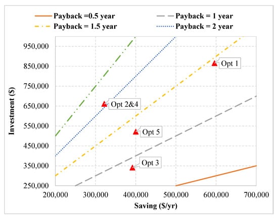 Options (3) and (5) showed the same energy savings but with different capital investments (USD 341,000 for option (3) and USD 522,000 for option (5)). Therefore, option (3) was preferred and considered the best among others, especially for the payback period of only 0.87 years (about 10 and a half months).