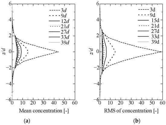 Figure 2b denotes the root-mean-square of concentration for the same points as (a). It can be confirmed that the high-concentration passive scalar diffuses downstream, and the maximum value is near the center. The concentration becomes uniform along the x-direction, such that the concentration becomes completely uniform and no characteristic image of concentration is obtained. In this study, the concentration profile still existed at 39