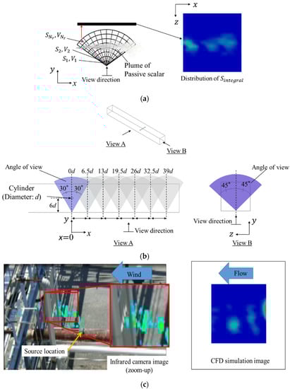 16] should be as high as O(100), which would have resulted in scalar distributions with a strong effect of turbulent diffusion and worked well for image recognition. At low Schmidt numbers, the molecular diffusion should dissipate the effective information more rapidly. In such cases, potential features in the downstream scalar distribution are lost, and the estimation of an upstream diffusion source is expected to be difficult. Thus, studies at a lower Schmidt number for typical gas are necessary to confirm the applicability of our method. In addition, the test images of our previous study were based on the concentration distribution of a plane sliced from a certain cross-sectional area. In actual plants, the aforementioned infrared camera image is a distribution image in which the concentration is integrated along the viewpoint direction. In this image, it was assumed that small-scale concentration gradients and micro-scale fluid dynamics are not clearly captured by the integration, and relatively large-scale concentration distributions dominate the image. It is considered that the eliminated information for micro-scale fluid dynamics, which includes the scalar diffusion information, affects the inference accuracy. Therefore, the image simulating an infrared camera should be evaluated for the application.