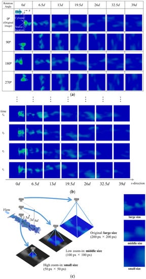 Figure 4c, low-zoom-in (100 px × 100 px) and high-zoom-in (50 px × 50 px) images were prepared for the original size (200 px × 200 px). Hereafter, these images are called “large size,” “middle size,” and “small size,” respectively.