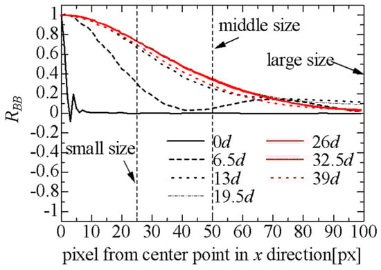 RBB ≈ 0.7 at the edge of the image (25 px), which is relatively higher. This means that a small-sized image captured only a part of the fluid motion dynamics, but not all motions and, therefore, it is difficult to make inferences from such limited information. Therefore, a large-sized image that can capture the overall gas cloud is necessary to improve the accuracy of inference.