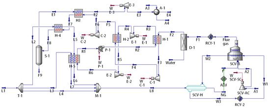 System A: HYSYS simulation model of SCV flue gas carbon capture using LNG cold energy. D-1: flue gas dehydrator; H-1–H-5: heat exchanger; C-1–C-2: compressor; E-1–E-3: turbine; P-1: working fluid pump; M-1: mixer; A-1: air temperature heater; S-1: separator; T-1: tee; SCV-AC: SCV air compressor; SCV-H: SCV heat exchange coil; SCV-B: SCV burner.