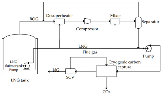 LNG is the main form of international natural gas trading. A standard vessel (125,000 m3) of LNG emits 220~300 thousand tons of CO2 equivalent from production to final usage, of which storage and regasification stages account for 0–3% [1]. The LNG receiving terminal can emit about 100 thousand tons of carbon annually [2]. In 2020, direct carbon emissions from SCV at an LNG receiving terminal reached 56 thousand tons. SCV uses the heat generated by the combustion of natural gas to gasify LNG [3,4]. In June 2019, Royal Dutch Shell announced that it had reached the world’s first carbon-neutral LNG trade with Tokyo Gas Co., Ltd. and South Korea’s GS Energy. As of September 2021, 24 ships running on carbon-neutral LNG have been traded globally [5]. Therefore, it is crucial to capture the carbon of SCV flue gases to achieve low-carbon operation to be carbon-neutral in the LNG receiving terminal. The CC (carbon capture) technologies include the chemical adsorption method, the physical absorption method, the membrane separation method, and the low-temperature separation method, etc. [6,7]. The cryogenic separation method uses the difference in bubble & dew points of each component in the flue gas, allowing CO2 to be condensed from the gas phase and transferred to the liquid phase or solid phase by compressing and cooling flue gas several times, to achieve CC. The disadvantage of the cryogenic separation method is that the conventional refrigeration process causes extensive energy consumption. However, at the LNG receiving terminal, the LNG cold energy can be used for the CCC (cryogenic carbon capture) process [8,9].