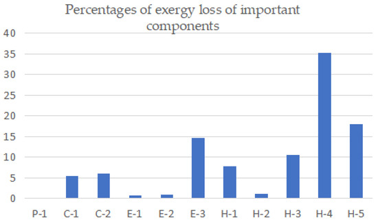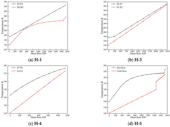 The exergy loss percentages of the System A components are shown in Figure 4, including heat exchangers, pumps, compressors, and turbines. Because of the temperature difference in the heat transfer process, the main exergy losses within the heat exchangers were the main exergy losses of the system (more than 72.4%). The exergy loss of other equipment accounted for 27.6% of system exergy loss, and the exergy loss of E-3 even reached 14.6%. For analyzing the exergy losses in heat exchangers, the temperature differences under the initial conditions in heat exchangers were calculated as shown in Figure 5. The LMTD (log mean temperature difference) of H-1, H-3, H-4, and H-5 was 12.21 K, 10.76 K, 12.32 K, and 20.41 K, respectively. In the heat exchanger (H-1, H-4, H-5), the matching degree of the temperature–heat flow curve of the cold and hot logistics was not high, resulting in a higher LMTD of the heat exchanger, which increased the exergy loss of the heat exchanger and reduced the exergy efficiency of the system.